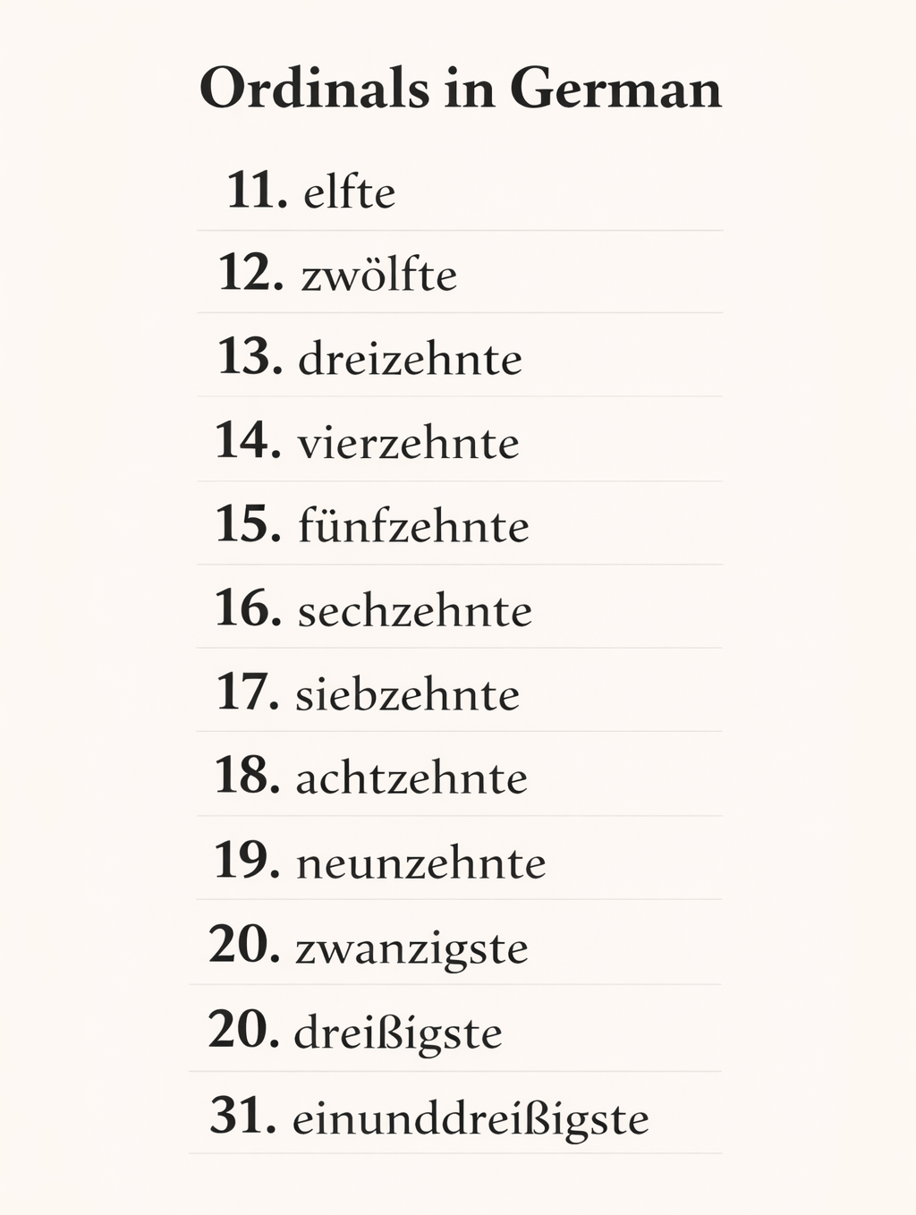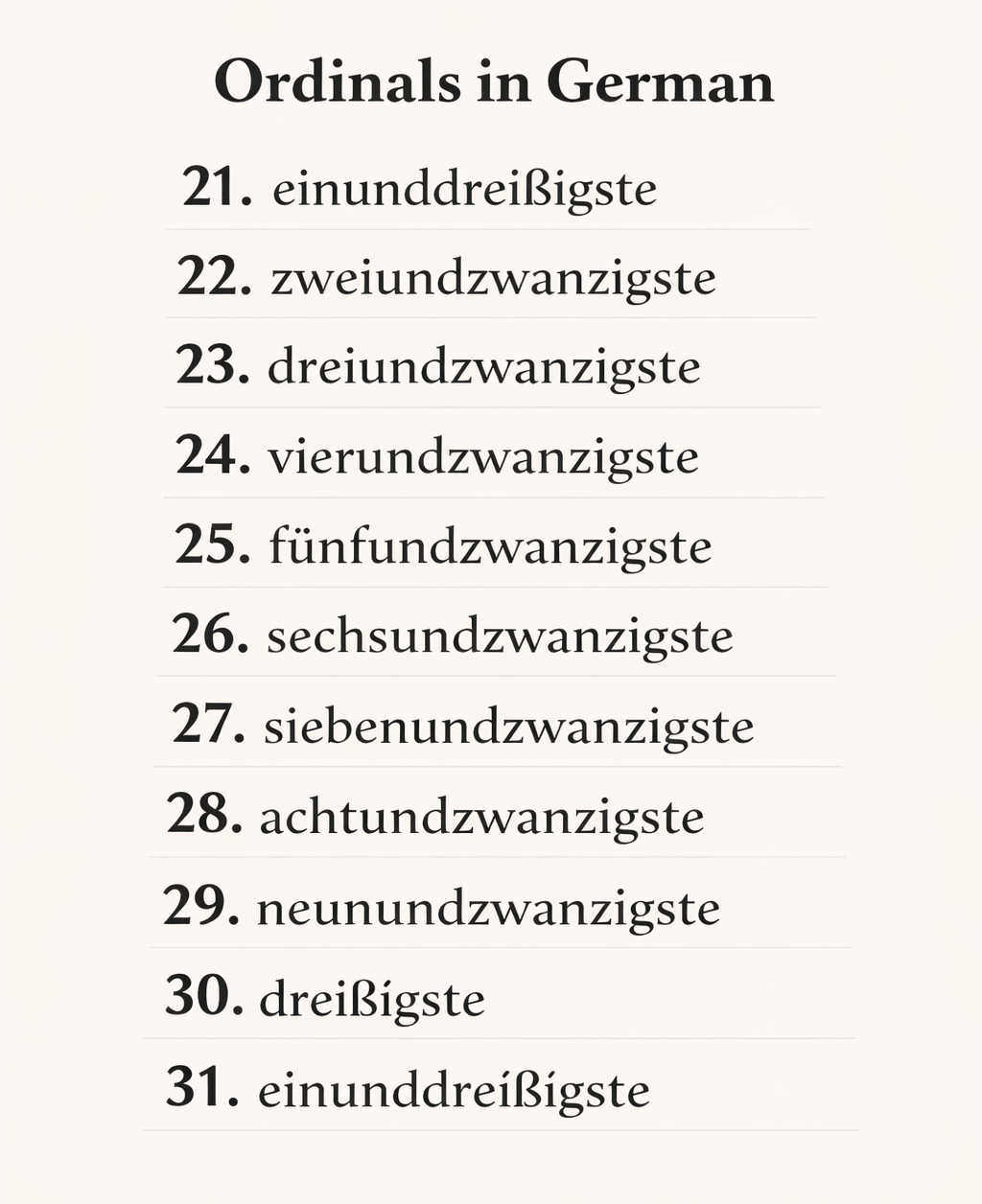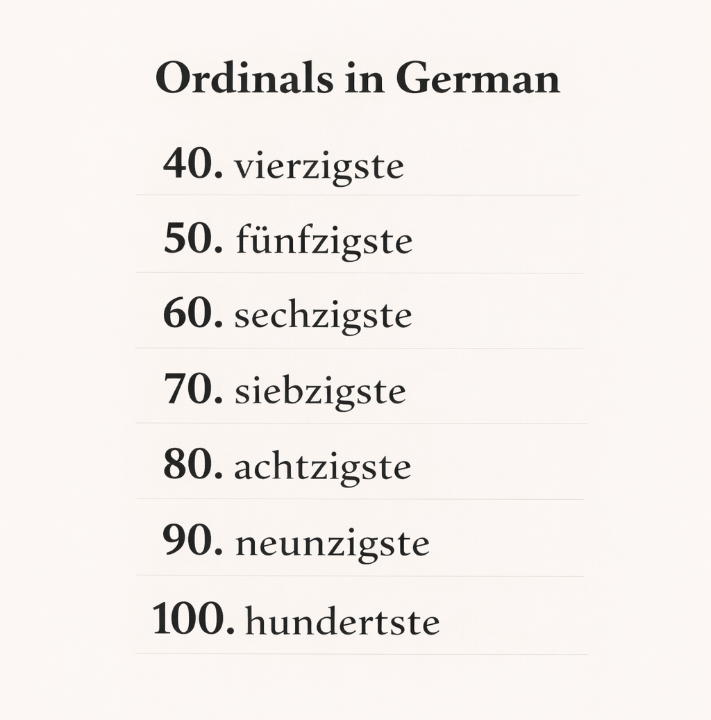 Ein und Dreiรigsten/Dreiรigsteย are the expressions for the number 31th. By referring to the ordinal numbers from 40 to 100 given below, we can form many other ordinal numbers.